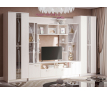 Стенка в гостиную Венеция шириной 3,4 метра в светлом оттенке дерева ясень белый. Гостиная представляет собой полный комплект мебели включающий шкафы для хранения вещей, витрины для посуды, тумбу для телевизора, открытые полки и выдвижной ящик.