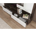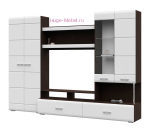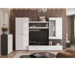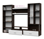 Современная стенка для гостиной с глянцевыми фасадами белого цвета и корпусом в цвете венге. Недорогая гостиная Вегас включает в себя вместительный шкаф, ТВ тумбу, шкаф со стеклом для посуды или книг и полку. При желании стенку можно дополнить шкафами или комодом из той серии мебели.