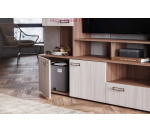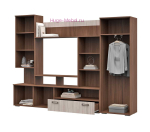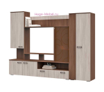 Недорогая стенка в гостиную в цвете ясень шимо светлый/темный с лаконичным современным дизайном и контрастной отделкой с фактурой дерева. Гостиная с платяным шкафом и закрытым шкафом для книг или посуды.