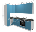 Угловая кухня 2.7 на 1.5 метра с высокими шкафами и голубыми матовыми фасадами МДФ. Кухонный гарнитур модульный и его размеры и комплектацию можно изменить.