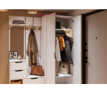 Комплект мебели в прихожую шириной 165 см состоит из вешалки и распашного шкафа для одежды. Прихожую и шкаф можно поставить рядом или по разным стенам, комплект можно дополнить комодом, пеналом или шкафом большего размера. Прихожая Руна белого цвета, высота 210 см. Напольная вешалка с зеркалом, комодом и тумбой для хранения обуви, шкаф глубиной 50 см подходит для верхней одежды и укомплектован двумя полками.