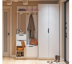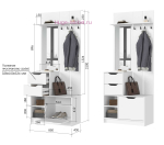 Недорогая готовая прихожая шириной всего 85 см станет отличным решением для небольших квартир. При желании прихожую можно дополнить шкафом или комод из серии Руна. Прихожая белого цвета представляет собой напольную вешалку с крючками для верхней одежды, зеркало, тумбу с откидной створкой для хранения обуви, два выдвижных ящика для перчаток и ключей, открытые полки для сумок или коробок. Высота прихожей 210 см.