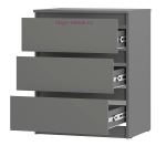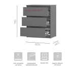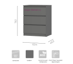 Современный и недорогой комод серого цвета с тремя выдвижными ящиками. Комод небольшого размера, его ширина всего 60 см. Ящики комода выдвигаются бесшумно за счет шариковых направляющих. Благодаря небольшим размерам и универсальному цвету комод можно разместить в гостиной, спальне и детской комнате. Комод Симпл входит в одноименную серию мебели с лаконичным дизайном и выпускается в двух цветах, белом и графитовом сером.