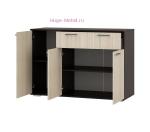 - модель состоит из трех секций: верхнего выдвижного ящика, левой части с распашной дверцей и нижней секции также с распашными дверцами и спрятанными за ними полками;