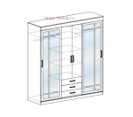 Недорогой шкаф купе белого цвета с фацетными зеркалами и выдвижными ящиками. Длина шкафа 170 см, внутри шкаф разделен на три отсека: справа и слева отделения со штангой, в центральном отсеке с распашными дверцами - полки. Боковые зеркальные створки шкафа-купе - раздвижные.