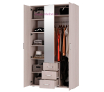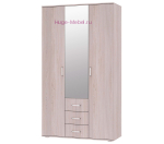 Недорогой трехстворчатый шкаф с зеркалом и тремя выдвижными ящиками. Шкаф Белла - универсальная модель, которая подходит для гостиной, спальни и детской комнаты. Шкаф светлого цвета, внутри шкафа отделение с полками шириной 38 см и отделение со штангой и антресольной полкой шириной 76 см.