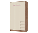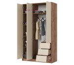 Распашной трехстворчатый шкаф шириной 120 см с 3 выдвижными ящиками. Шкаф для одежды без зеркал с двумя отделениями внутри: отсек со штангой шириной 76 см и отделение с полками шириной 38 см. Три выдвижных ящика с надежным механизмом полного выдвижения и фасадами расположенными под углом для удобства открывания, створки шкафа открываются нажатием.