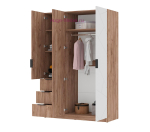Современный 3-х створчатый шкаф с зеркалом и тремя выдвижными ящиками. Шкаф для одежды шириной 120 см с двумя отделениями внутри: отсек шириной 76 см со штангой для одежды и антресольной полкой и отделение с двумя полками шириной 38 см с тремя выдвижными ящиками внизу. Фасады с оригинальной фрезеровкой из МДФ с качественным матовым покрытием белого цвета, корпус под дерево в цвете дуб крафт табачный.