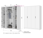 Недорогой четырехстворчатый шкаф белого цвета. Шкаф шириной 160 см без зеркал с лаконичным дизайном, 4 дверцы обеспечивают удобный доступ к вещам. Внутри шкафа три отделения: два отсека с полками слева и справа и центральный отсек со штангой для одежды с двумя полками для вещей и обуви.