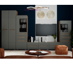 Недорогой шкаф для посуды Наоми с витриной и выдвижным ящиком. Шкаф витрина для модульной гостиной Наоми может быть дополнен шкафами для одежды и ТВ тумбой в том же стиле.