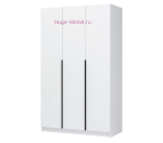 Высокий 3-створчатый шкаф для одежды со штангой, полками и с двумя ящиками внутри. Шкаф дополнен антресолью высотой 40 см. Современный шкаф белого цвета без зеркал с черной ручкой.